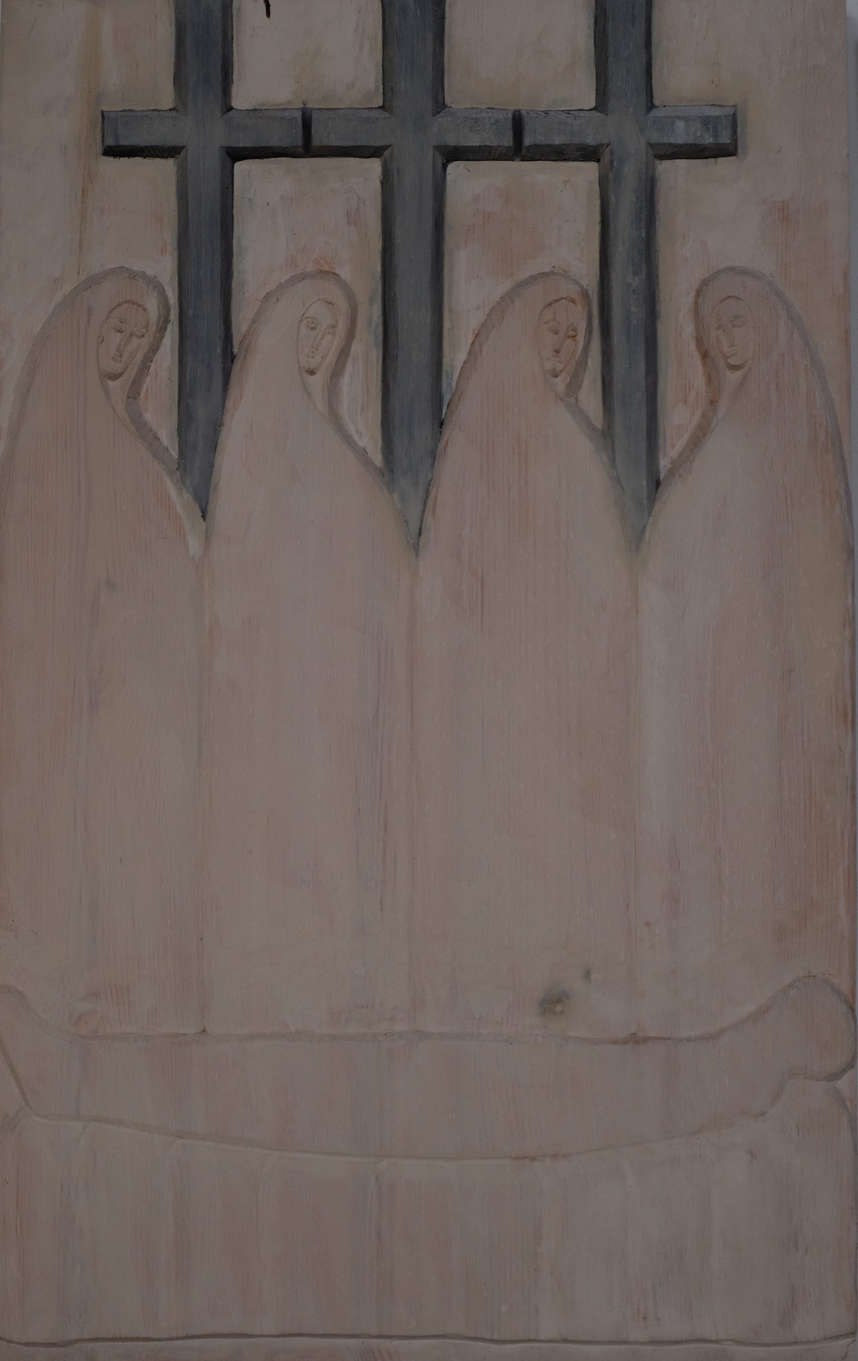 Wir sehen die Kreuzigungsgruppe auf Golgota im Hintergrund mit den drei Kreuzen. Besonders ist hier, dass diese drei Kreuze vom Künstler gleich groß dargestellt werden. Die Kreuze stehen im Hintergrund zwischen vier Frauen, drei sehen nach rechts und eine nach links, die Köpfe gesenkt. Die Frauen sind alle seitlich dargestellt, die Gesichter seitwärts zu dem Betrachter gerichtet.  Der Leichnam Jesu liegt bereits in ein Leinentuch gehüllt auf felsigem Grund vor den Frauen, den Kopf etwas erhöht.