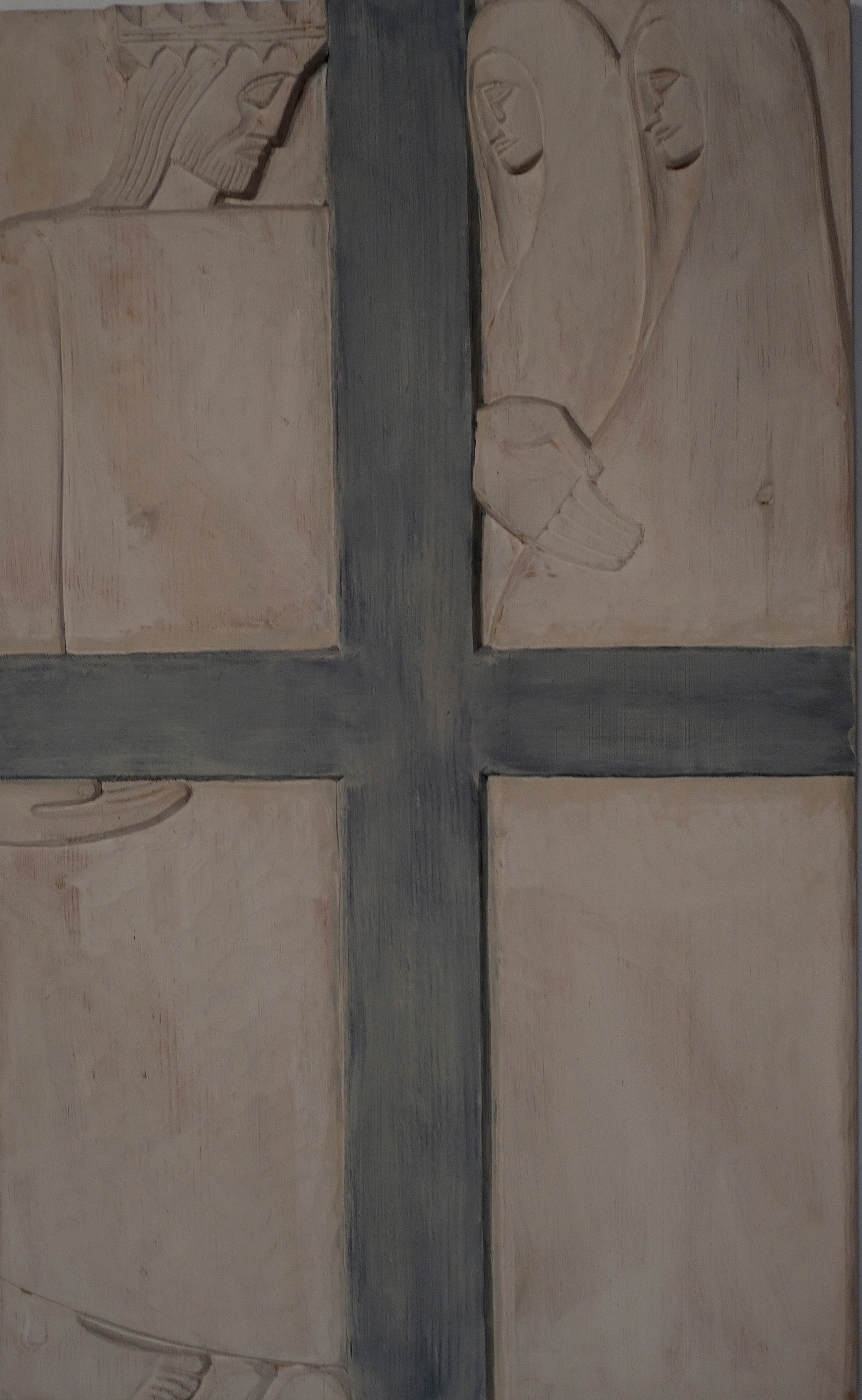 Übermächtig steht das Kreuz im Zentrum des Bildes. Im Hintergrund erkennen wir sorgsam angeordnete Steine. Ist es eine Mauer, durch die es keine Tür, keinen Ausweg für Jesus aus seiner derzeitigen Situation gibt?