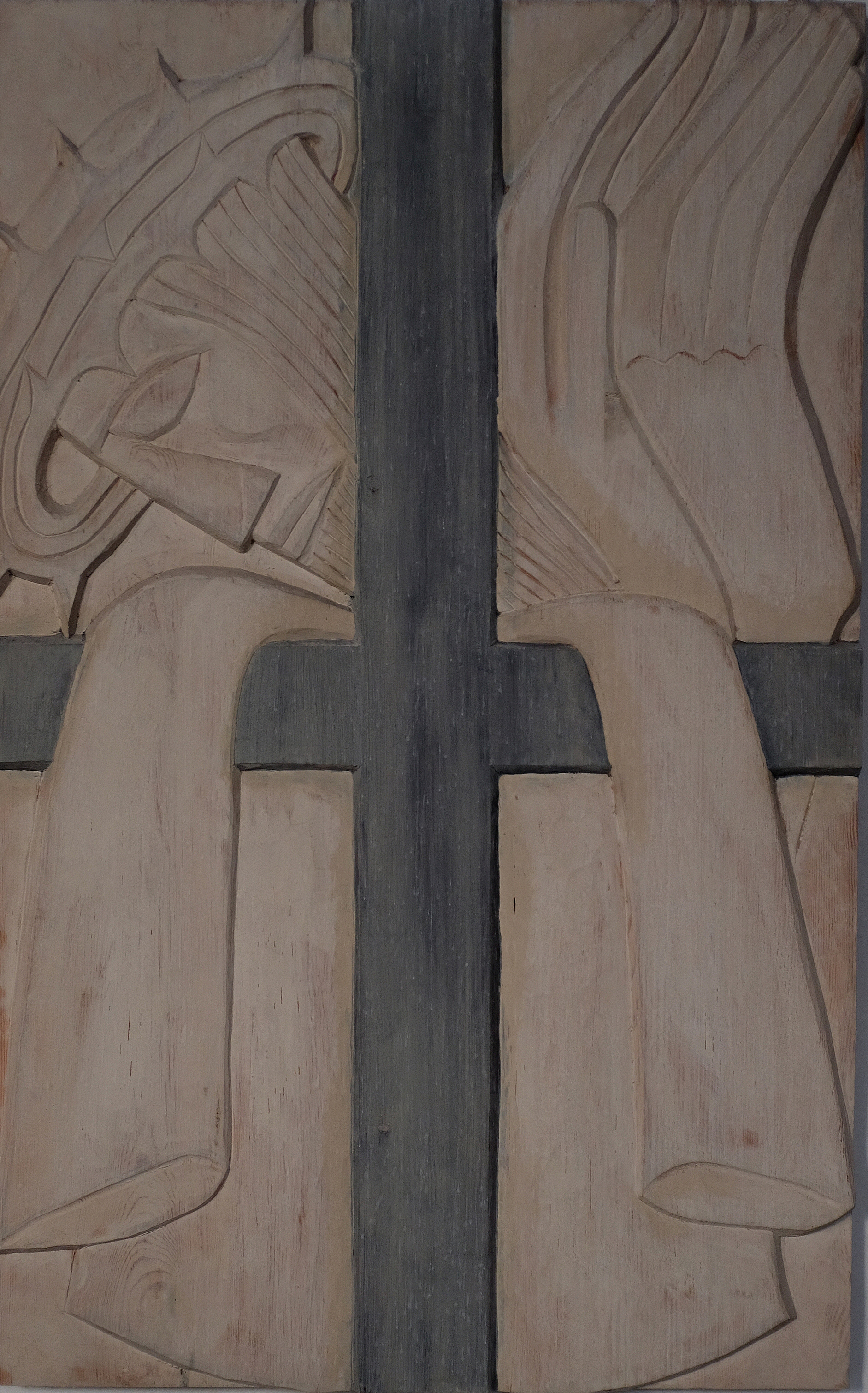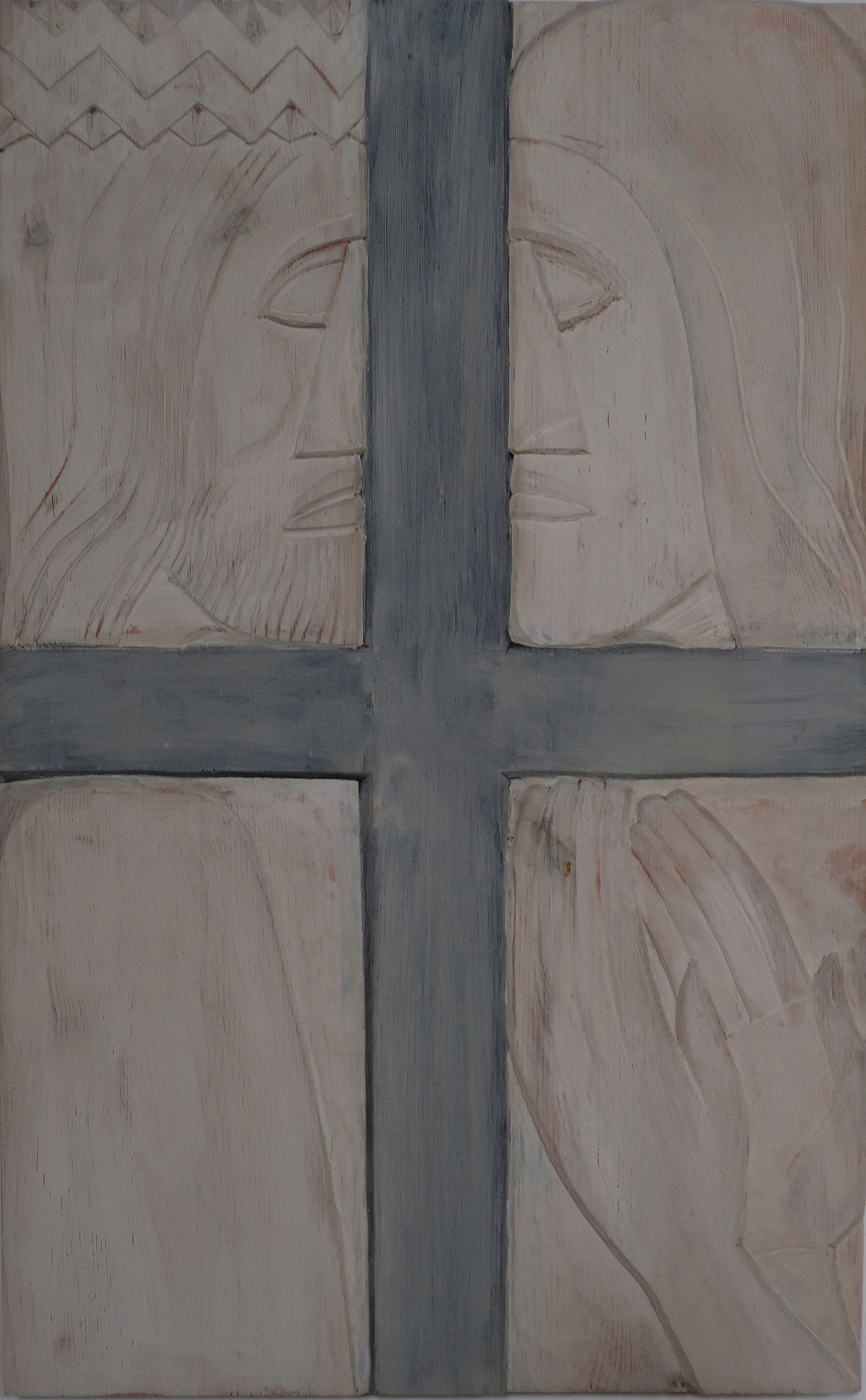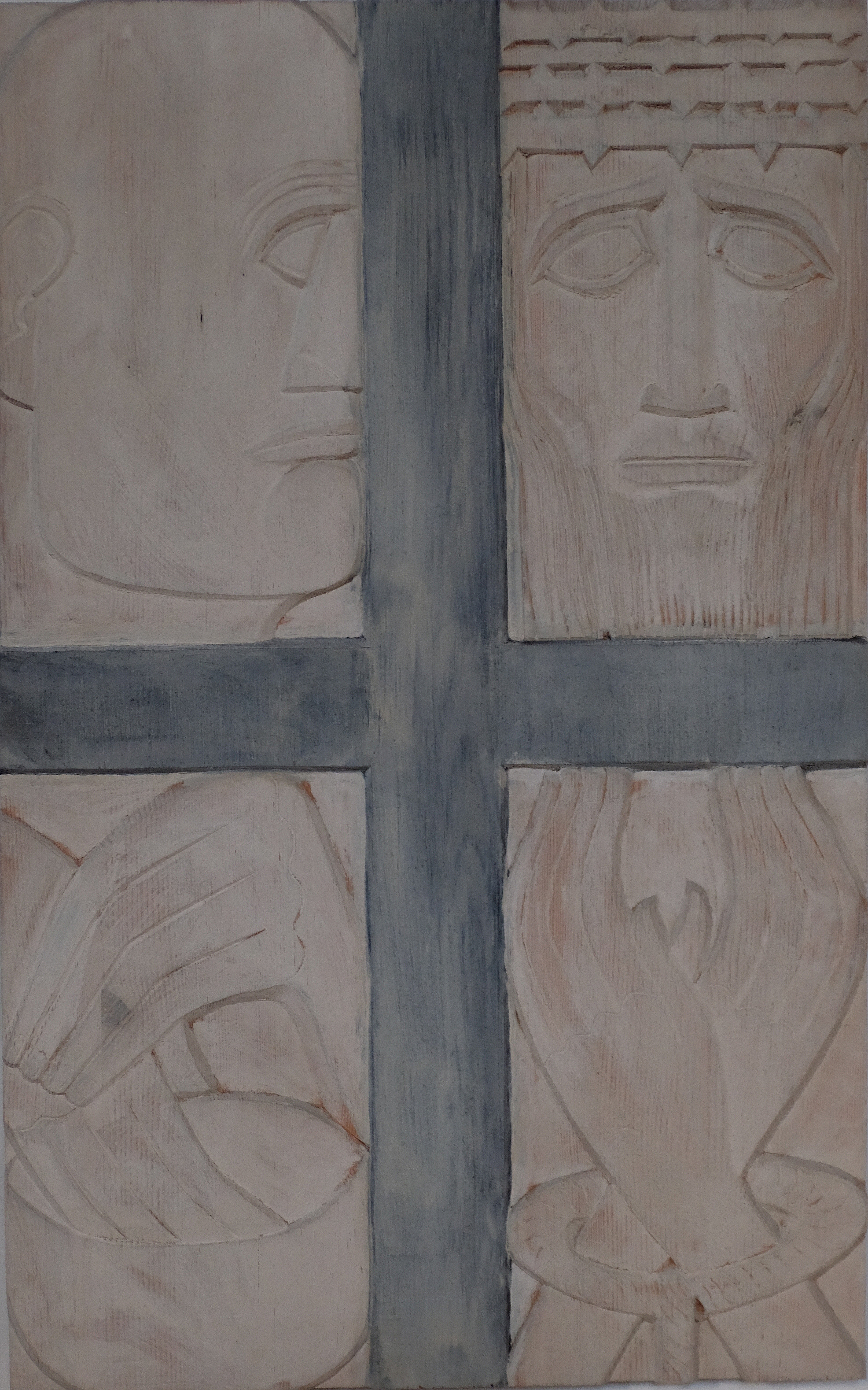 Aufrecht stehende Kreuze teilen die Bilder des Künstlers in vier gleiche Teile. Links oben ein strenges kantiges Gesicht von der Seite betrachtet. Der Schädel kahl, Auge, Nase und Mund stoßen direkt ans Kreuz, die Ohren sind nur angedeutet. Deutlich sind links unten die Hände zu erkennen. In der linken Hand vielleicht ein Tuch. Es ist Pilatus, der seine Hände wäscht. Auf der rechten Seite sehen wir Jesus gekrönt mit der Dornenkrone. Das Gesicht ist von der Folterung bereits gezeichnet. Der Blick ist leer. Die gefesselten Hände sind nach oben gestreckt.