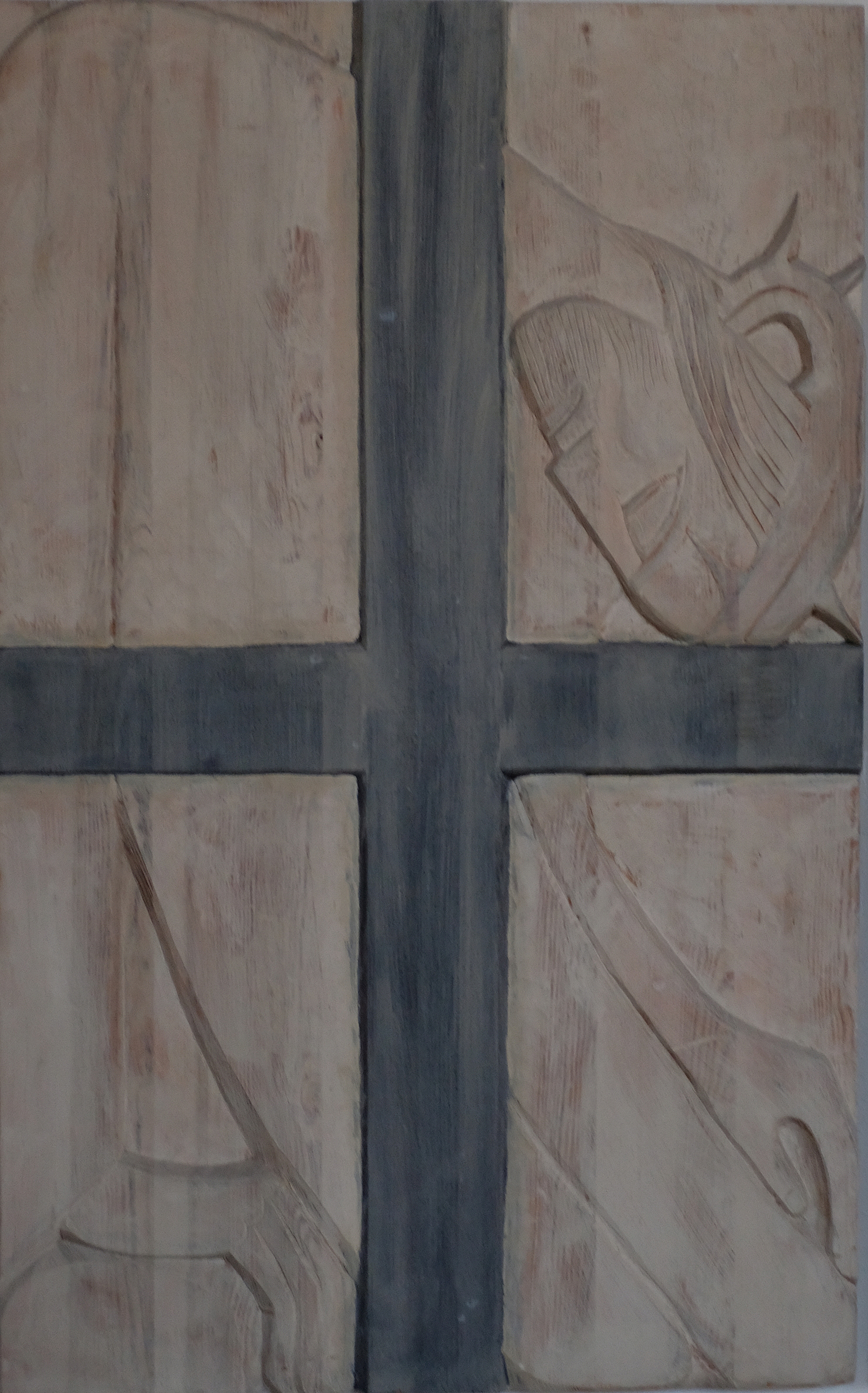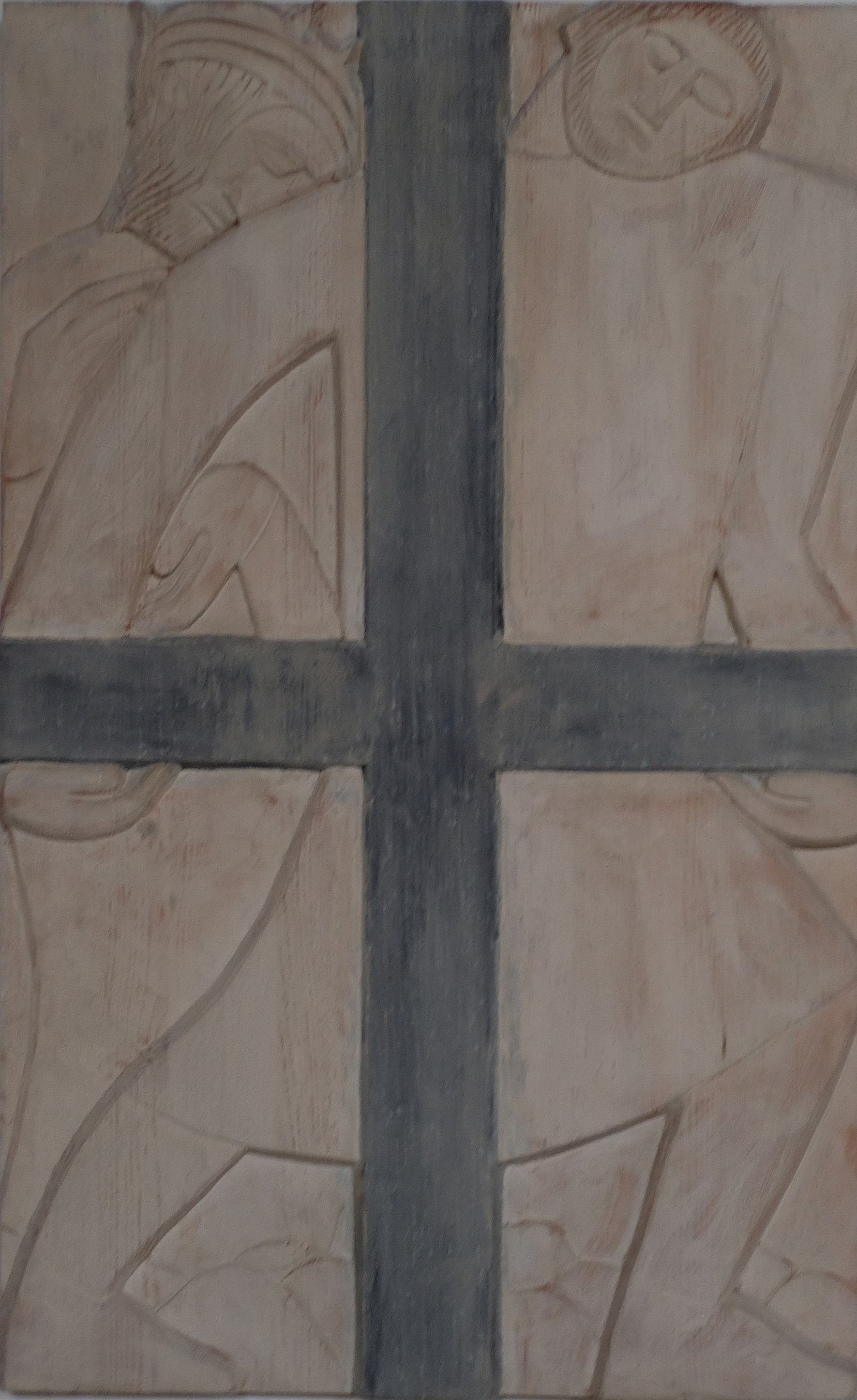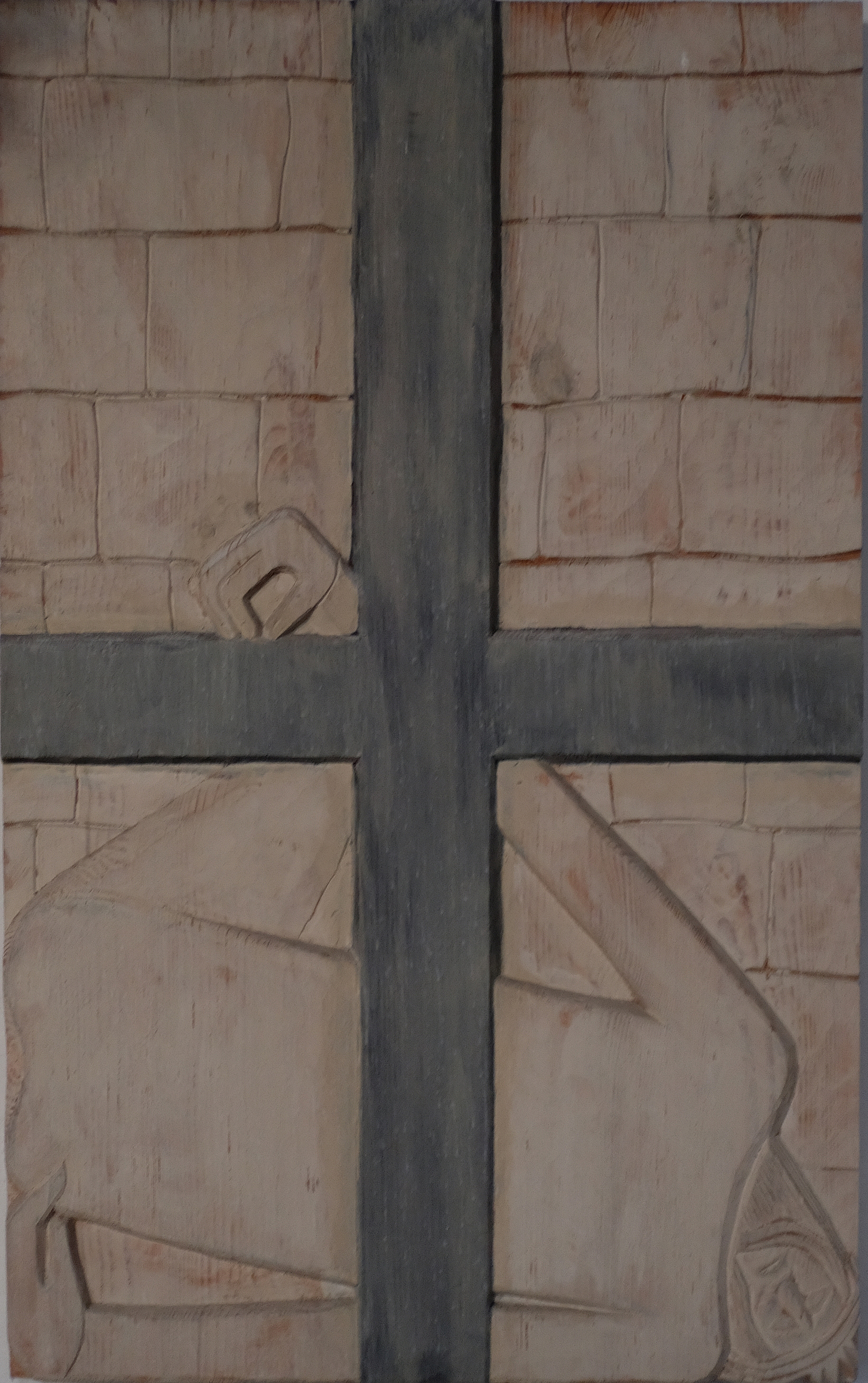 Übermächtig steht das Kreuz im Zentrum des Bildes. Im Hintergrund erkennen wir sorgsam angeordnete Steine. Ist es eine Mauer, durch die es keine Tür, keinen Ausweg für Jesus aus seiner derzeitigen Situation gibt?