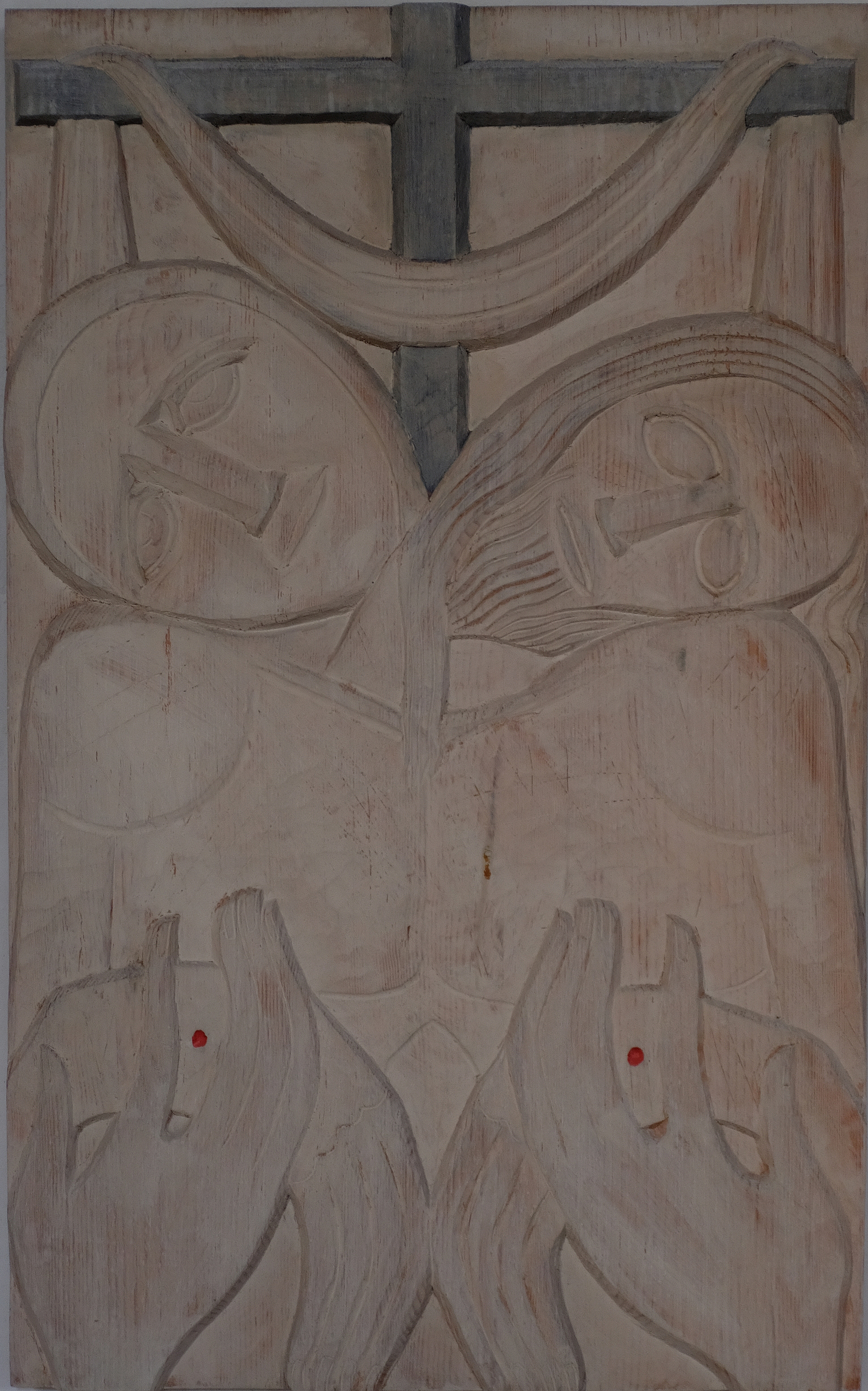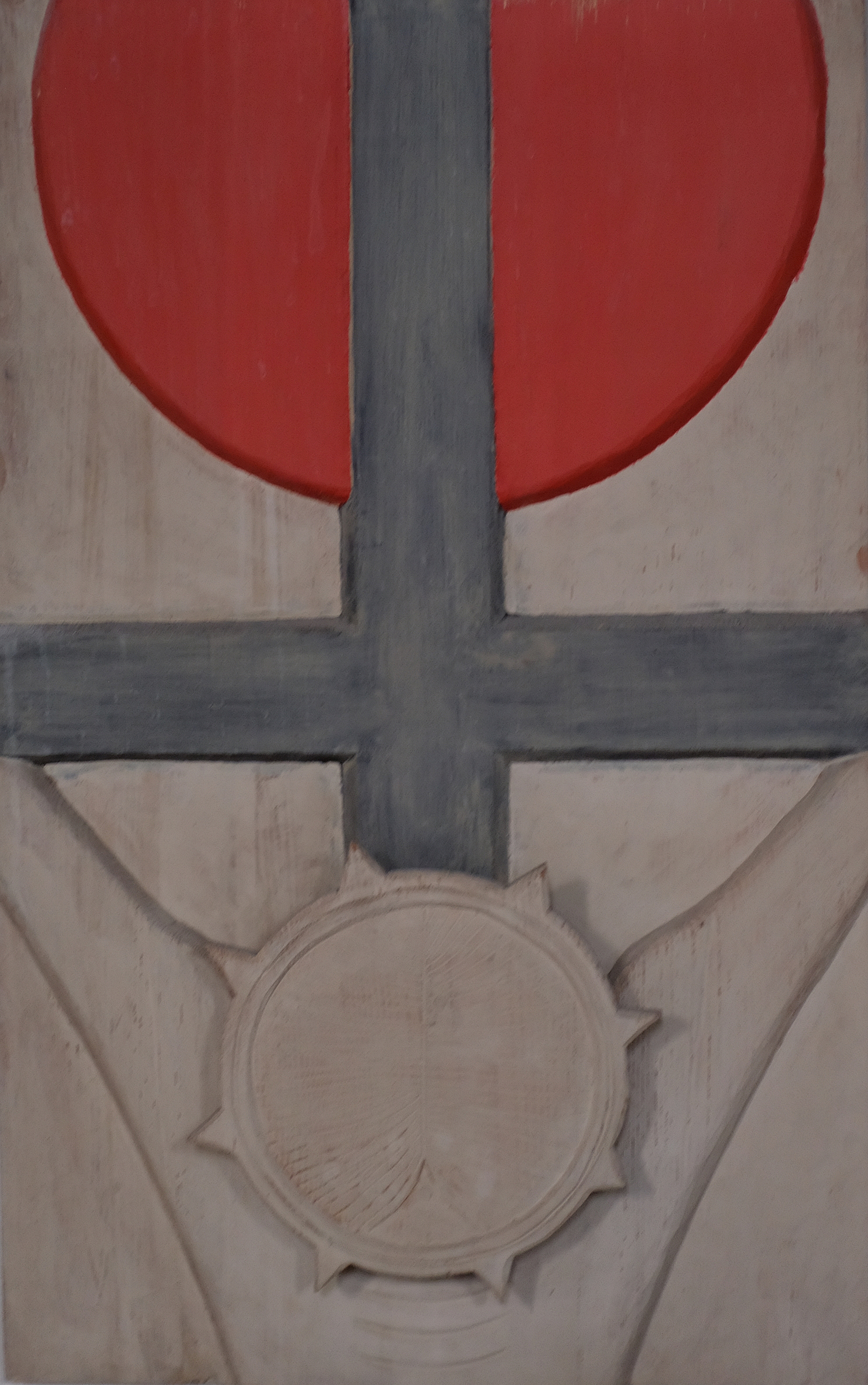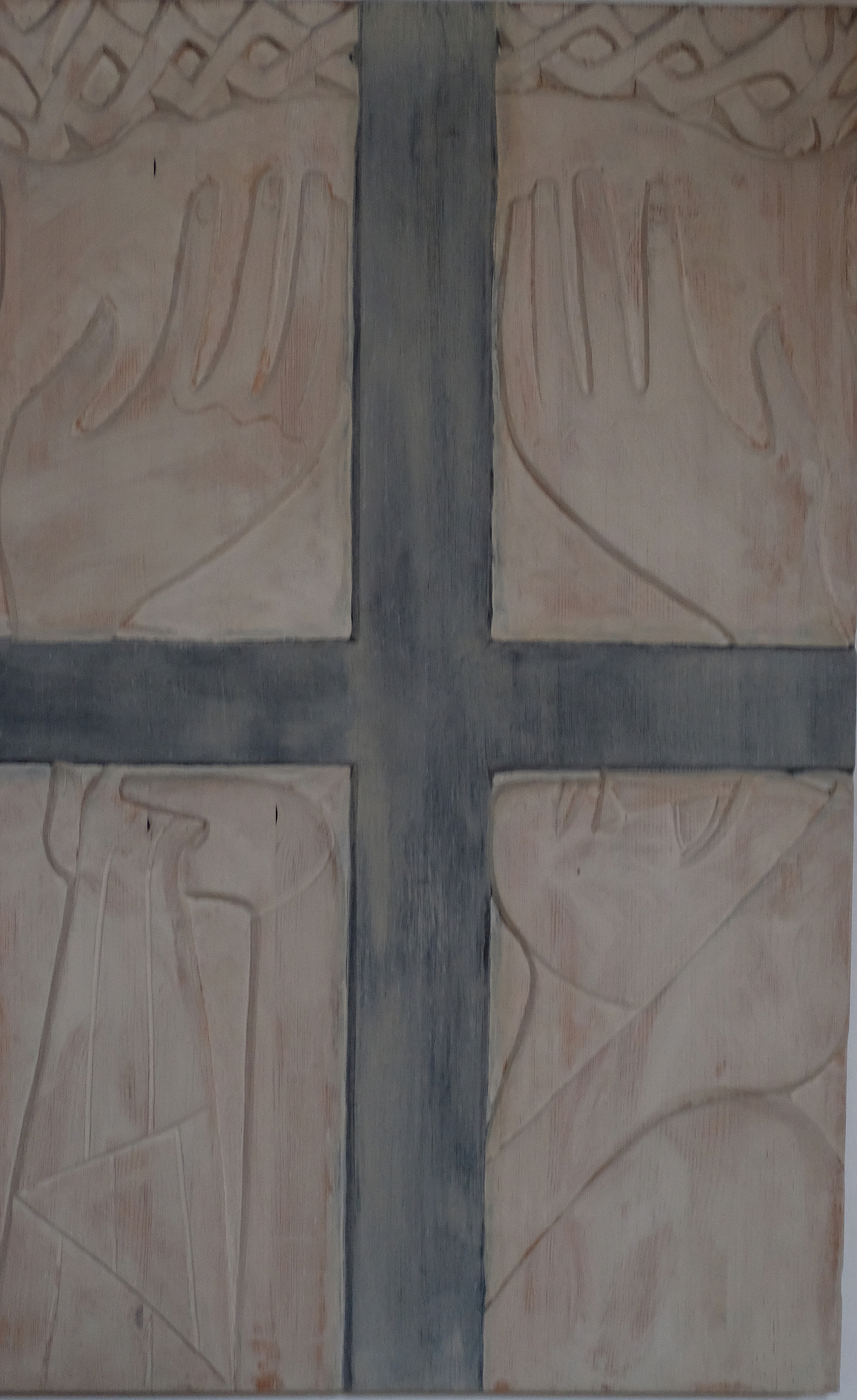 Übermächtig steht das Kreuz im Zentrum des Bildes. Im Hintergrund erkennen wir sorgsam angeordnete Steine. Ist es eine Mauer, durch die es keine Tür, keinen Ausweg für Jesus aus seiner derzeitigen Situation gibt?