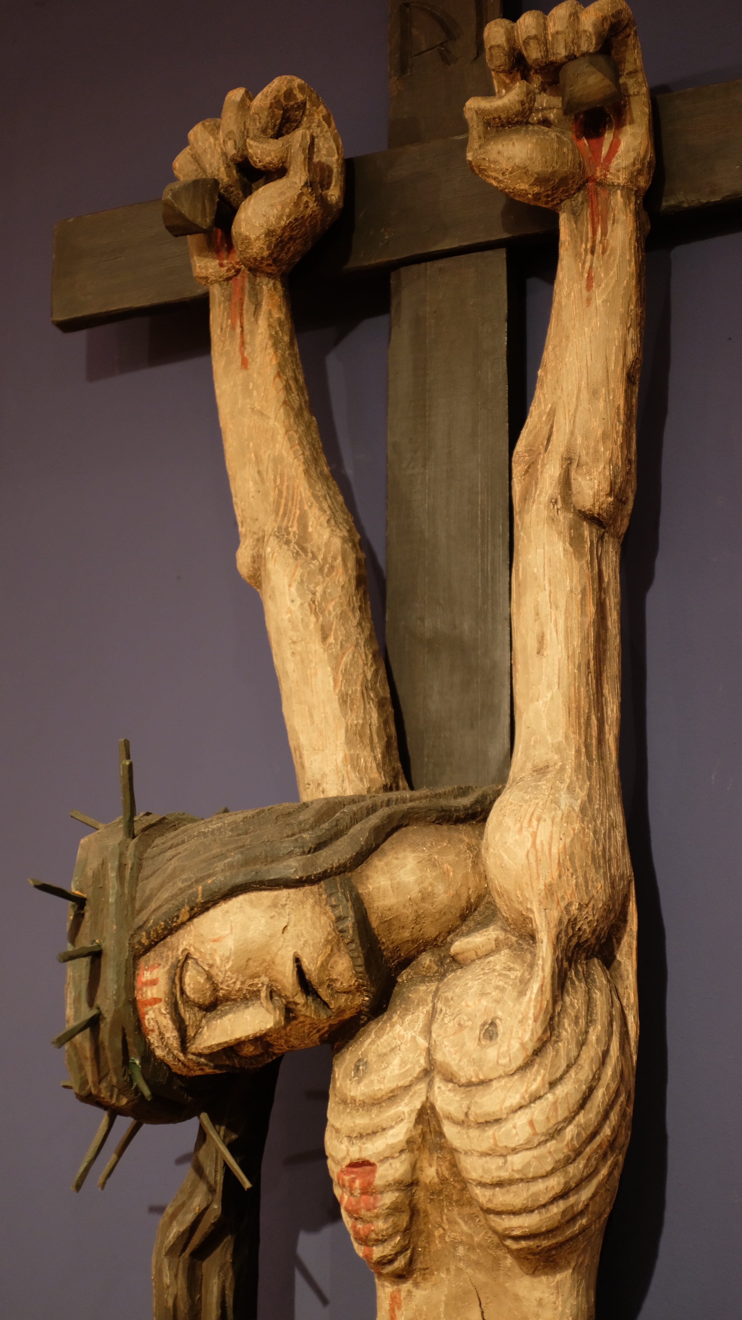 Wir erkennen, dass der Kopf mit der Dornenkrone nach vorne gesunken ist, Jesus hängt mittig im Kreuz in der unteren Hälfte des Bildes.  Man erkennt, dass Jesus hier am Kreuz gestorben ist und tot und schlaff nur noch von Nägeln gehalten wird.
